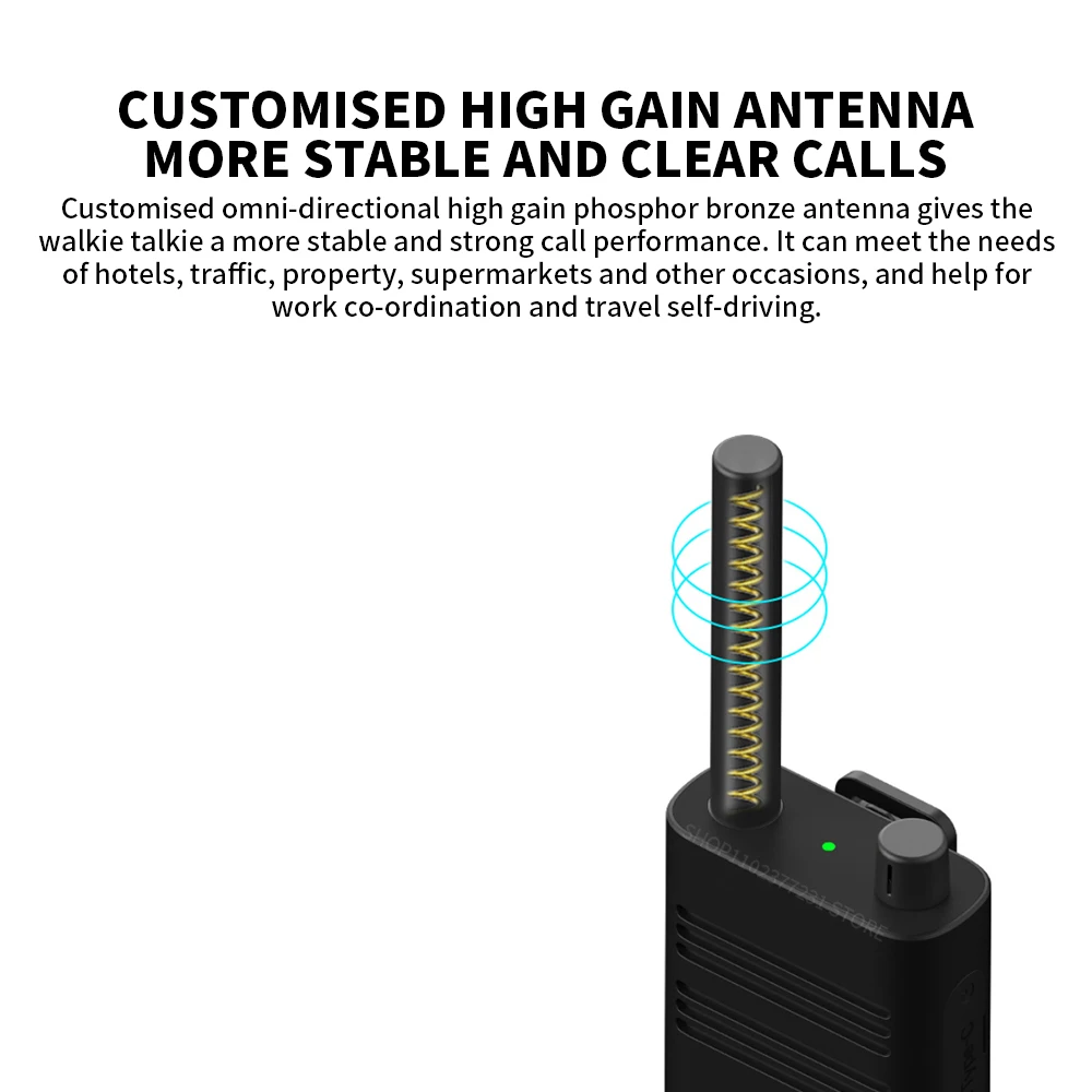 Customised omni-directional high gain phosphor bronze antenna gives the walkie talkie a more stable and strong call performance. it can meet the needs of hotels, traffic, property, supermarkets and other occasions, and help for work co-ordination and travel self-driving.