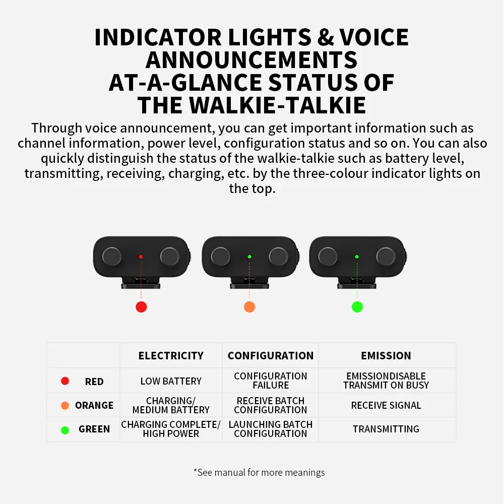 Through voice announcement, you can get important information such as channel information, power level, configuration status and so on. You can also quickly distinguish the status of the walkie-talkie such as battery level,transmitting, receiving, charging, etc. by the three-colour indicator lights on the top.