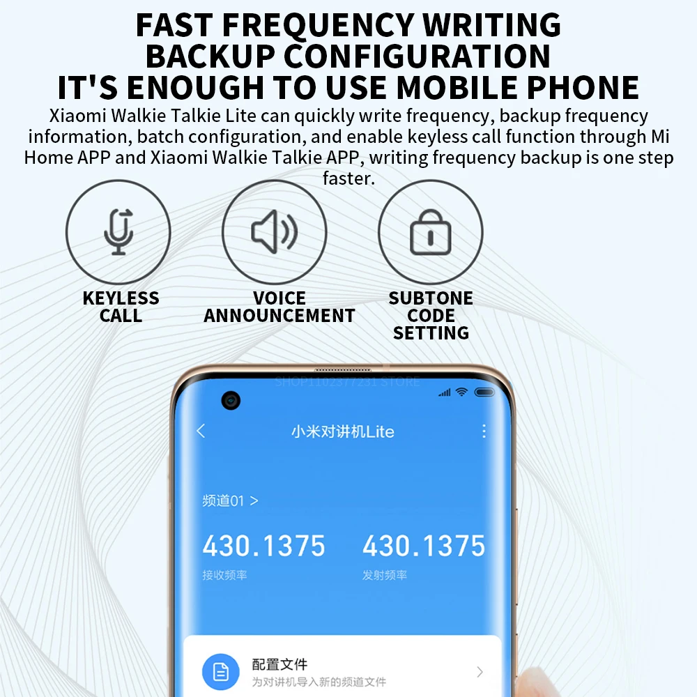 Xiaomi Walkie Talkie Lite can quickly write frequency, backup frequency information, batch configuration, and enable keyless call function through MiHome APP and Xiaomi Walkie Talkie APP, writing frequency backup is one stepÂ