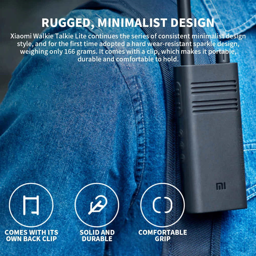 Xiaomi Walkie Talkie Lite continues the series of consistent minimalist design style, and for the first time adopted a hard wear-resistant sparkle design,weighing only 166g. lt comes with a clip, which makes it portable,durable and comfortable to hold.
