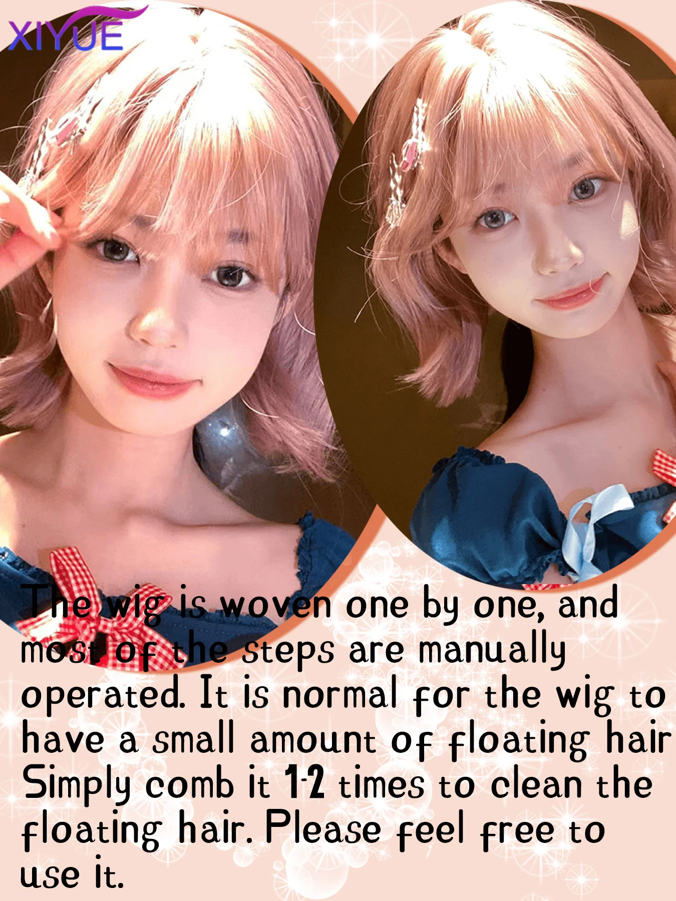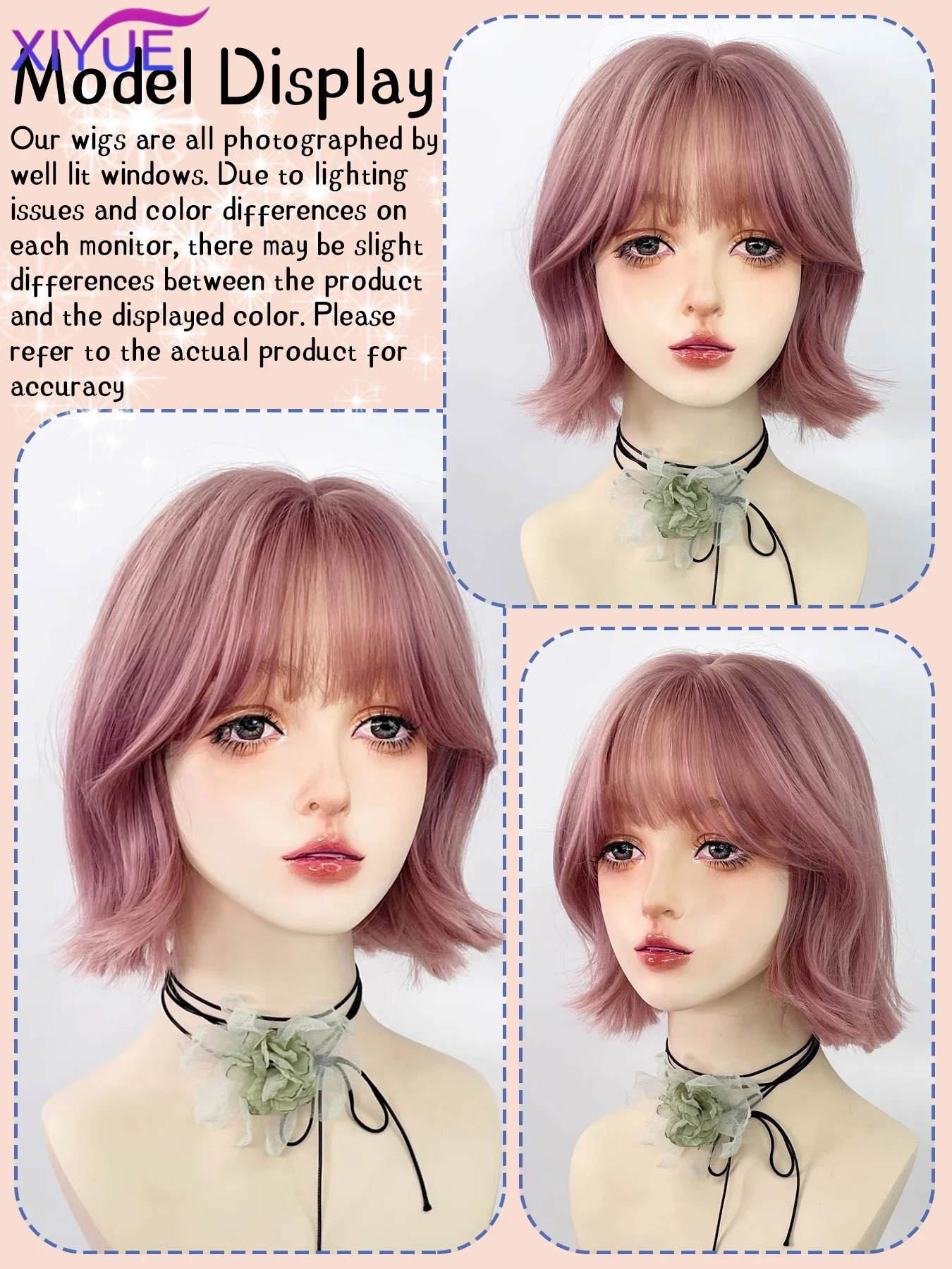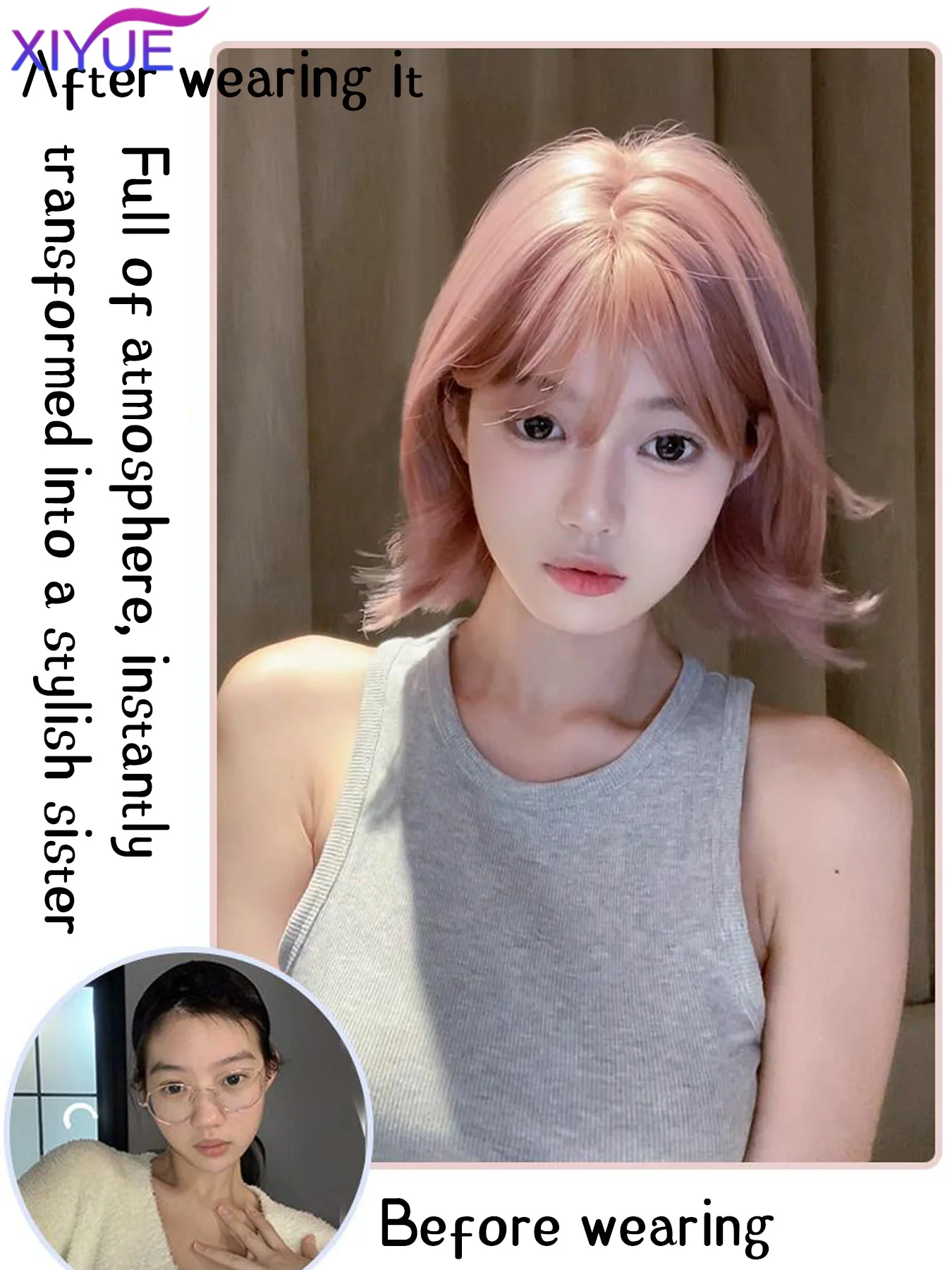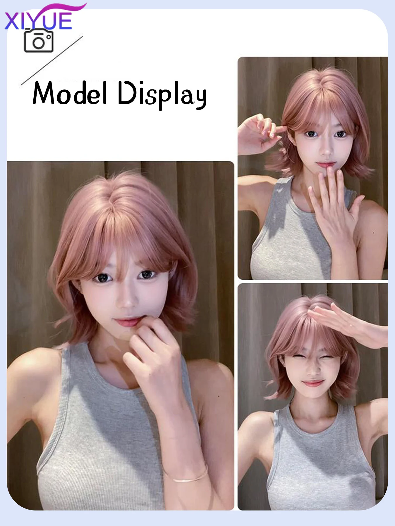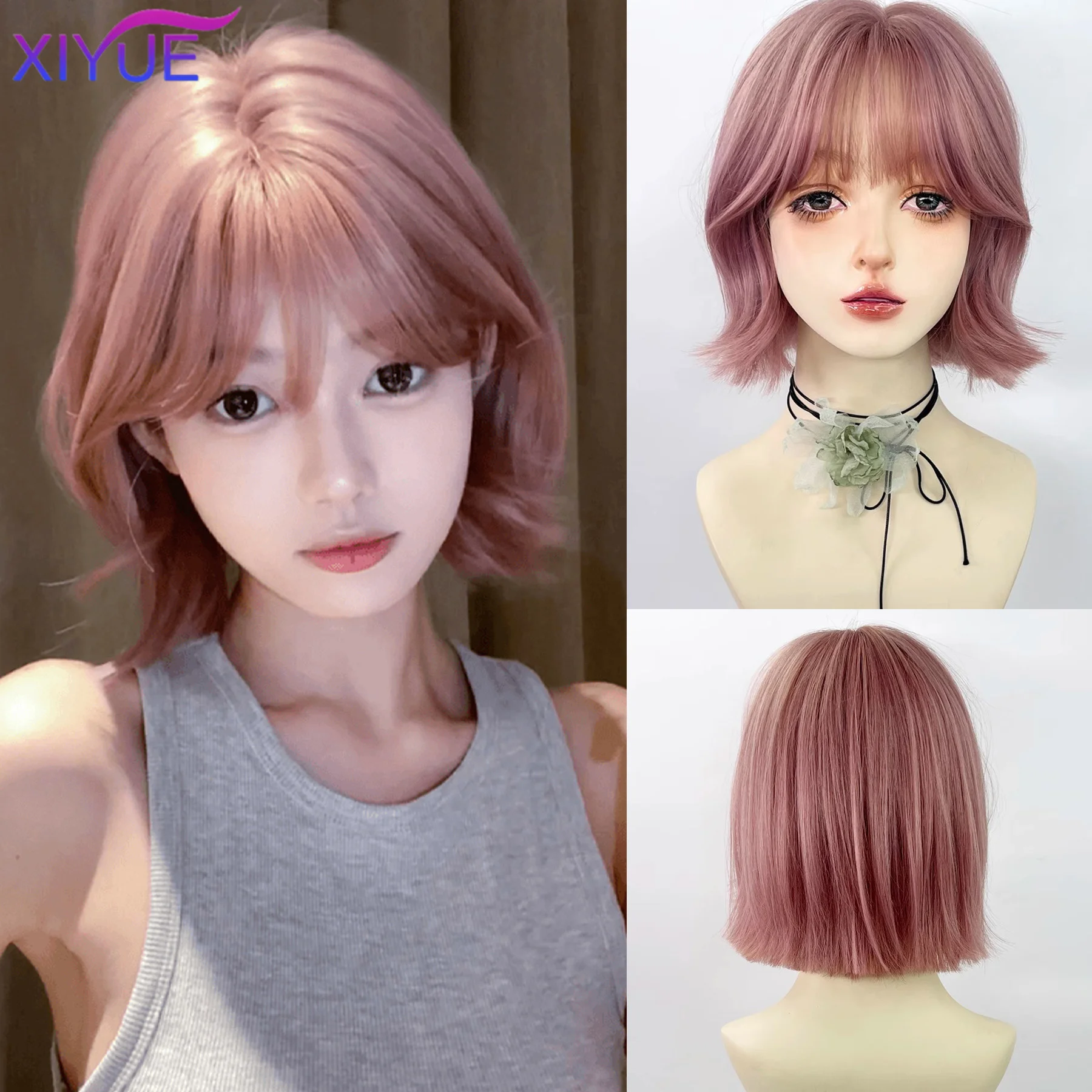 XIYUE Short Straight Bob Synthetic Wigs Pink Natural Hair Wig with Bangs for Women Cosplay Cute Wig Heat Resistant Fiber