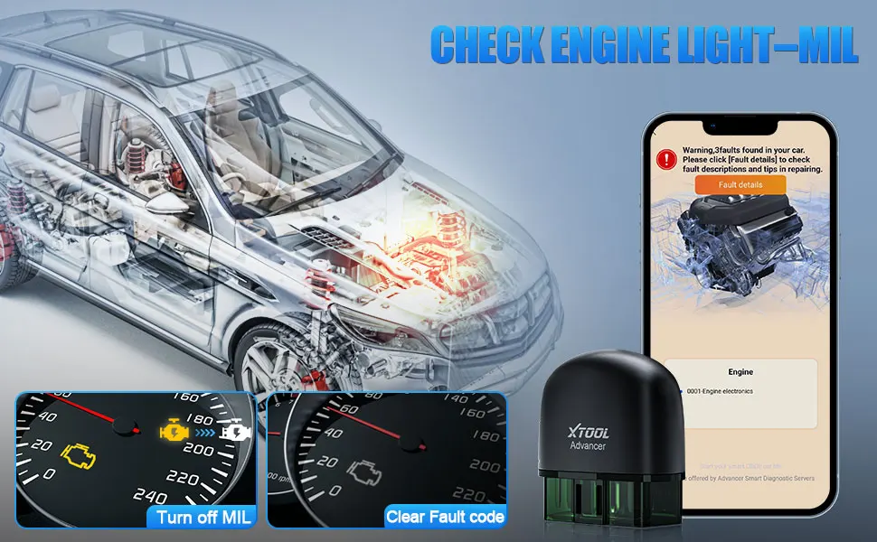 2. When your car detects an emission-related problem, the Check Engine Light will be turned on. With XTOOL AD20 car reader, you can read code to quickly find out why the check engine light is on and reset it.