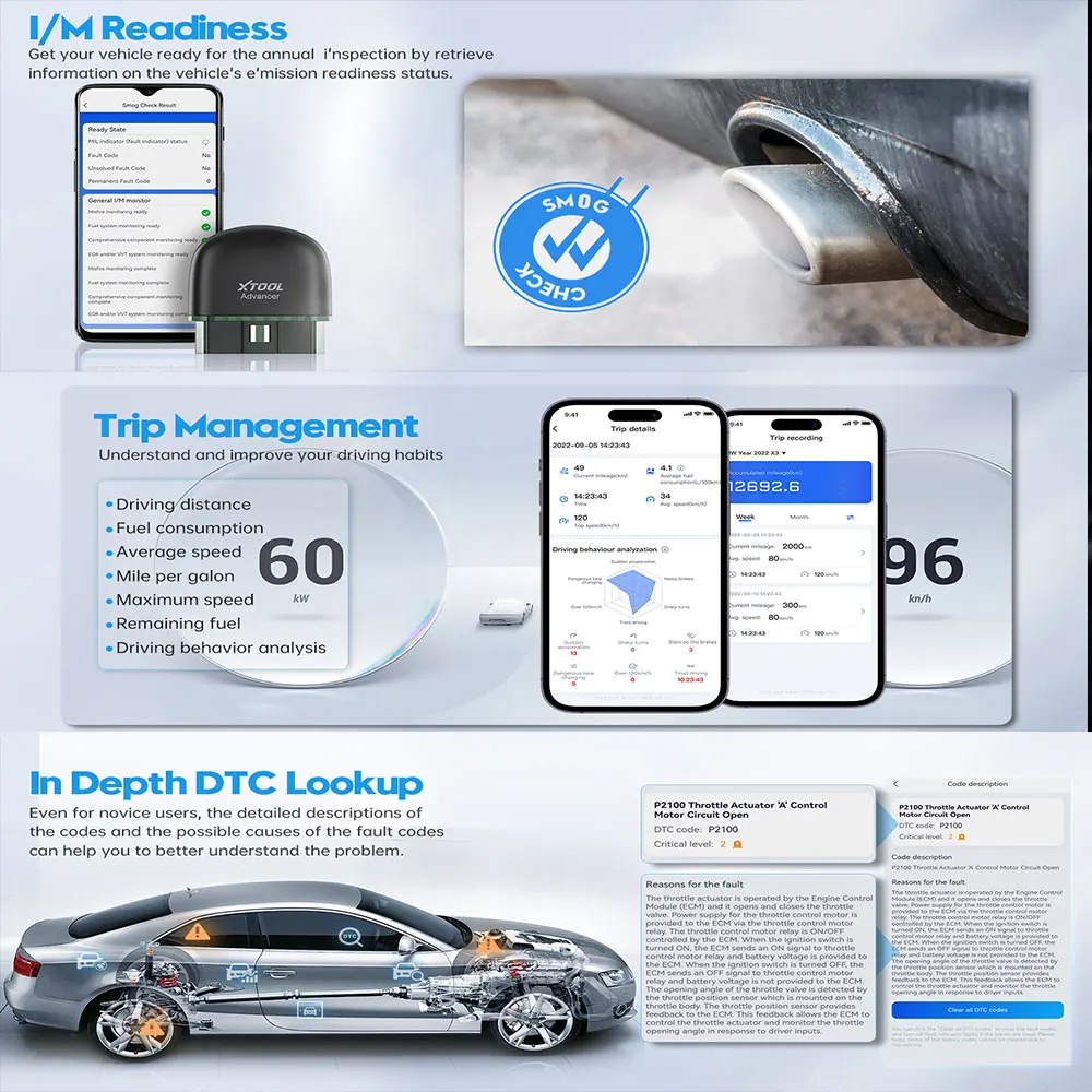 Display the route map of each trip, analyze key vehicle performance data such as driving distance, maximum speed, maximum revolutions, maximum temperature, average fuel consumption, etc. It can record a series of data analysis such as rapid acceleration, sharp turns, emergency situations. Encourage you to develop good driving habits.
