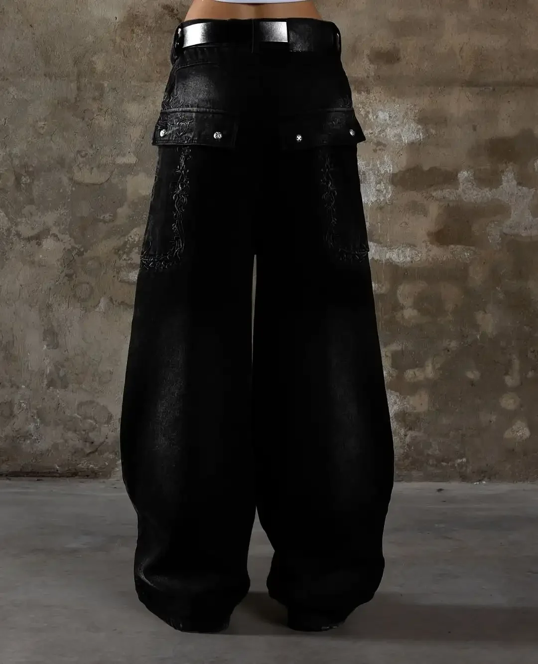 Retro American High Street Embroidered Jeans Black Baggy Patchwork Y2K Goth Men Denim Pants Fashion Hip Hop Wide-leg Jeans Women