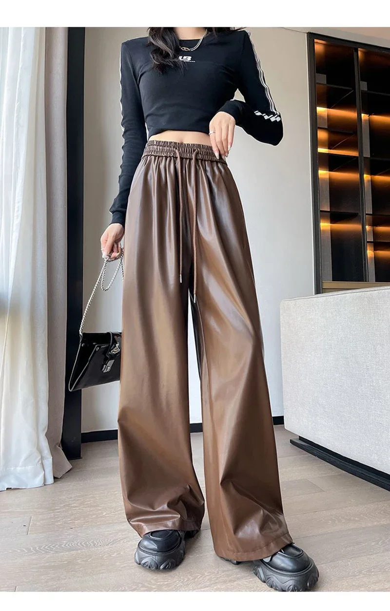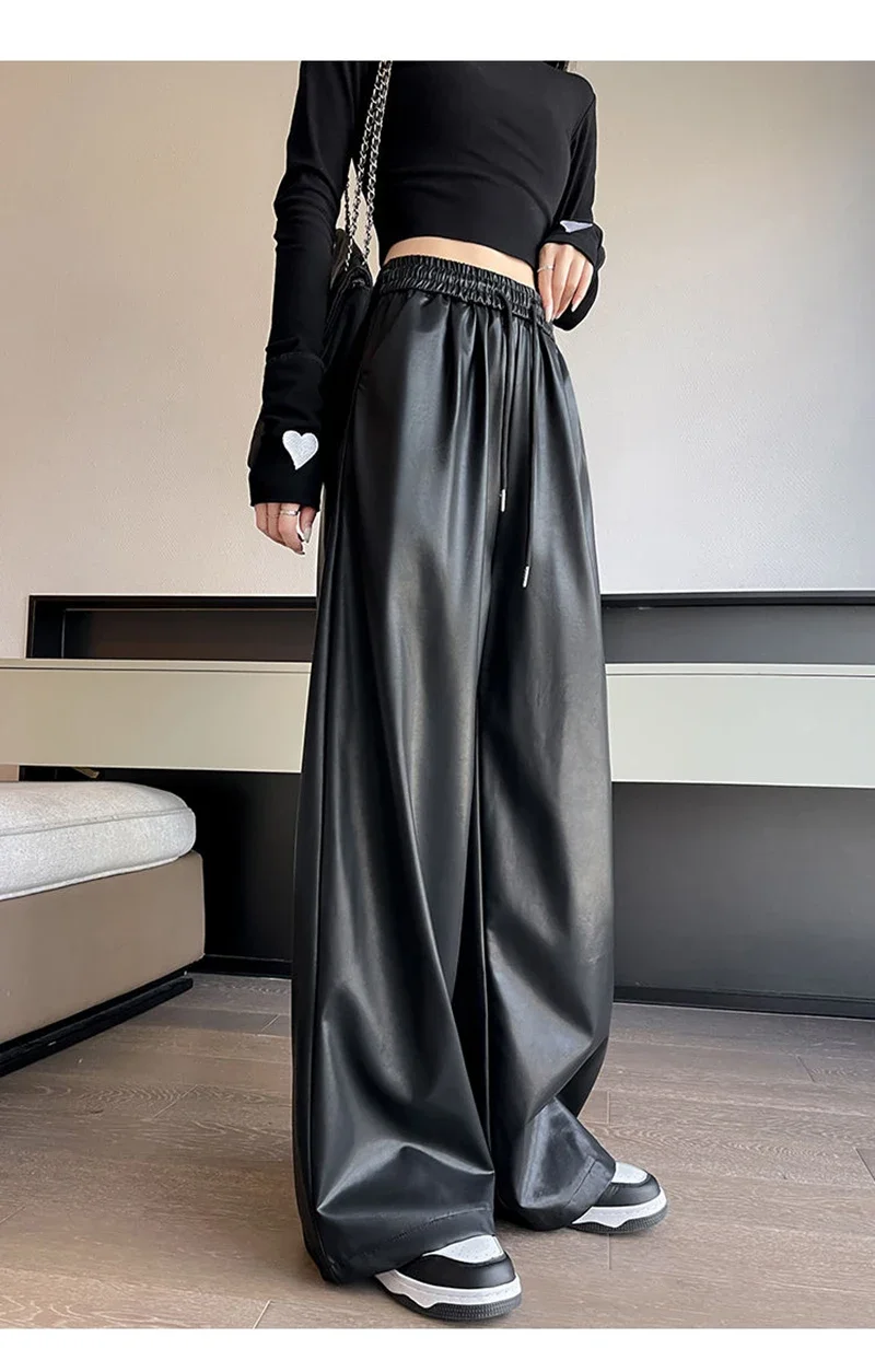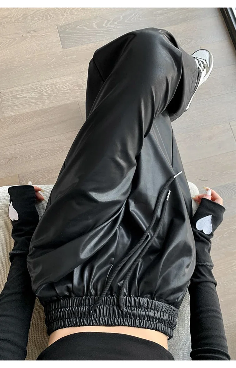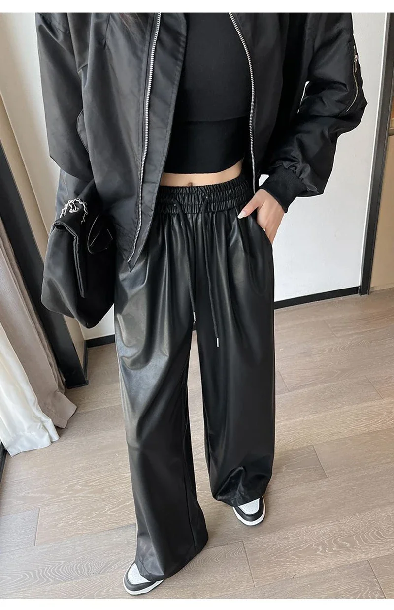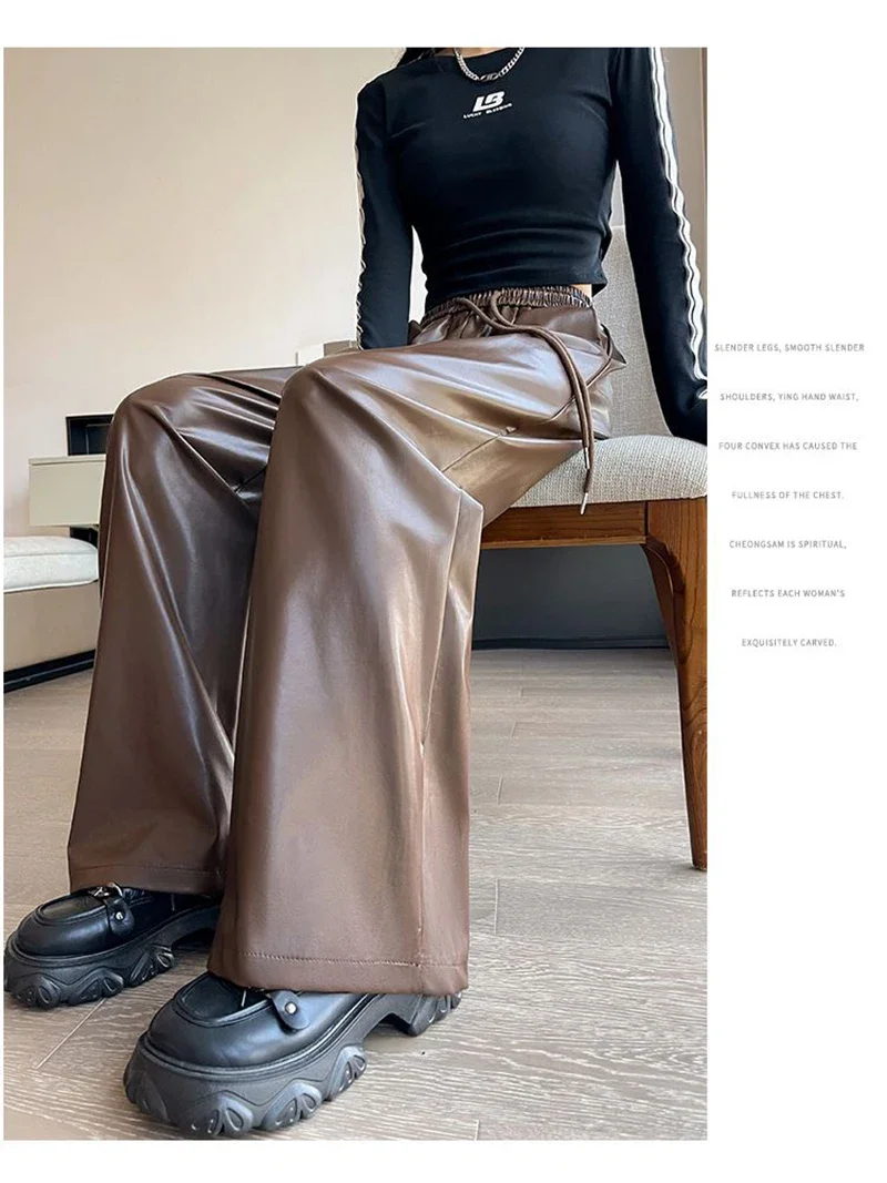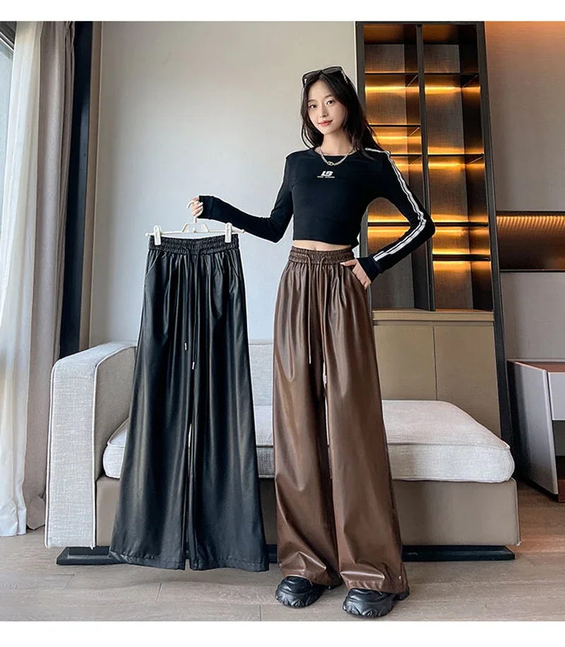 Y2K Vintage Pu Faux Leather Trousers Women Fall Wide Leg Pants Korean Drawstring High Waist Loose Pocket Solid Straight Bottoms