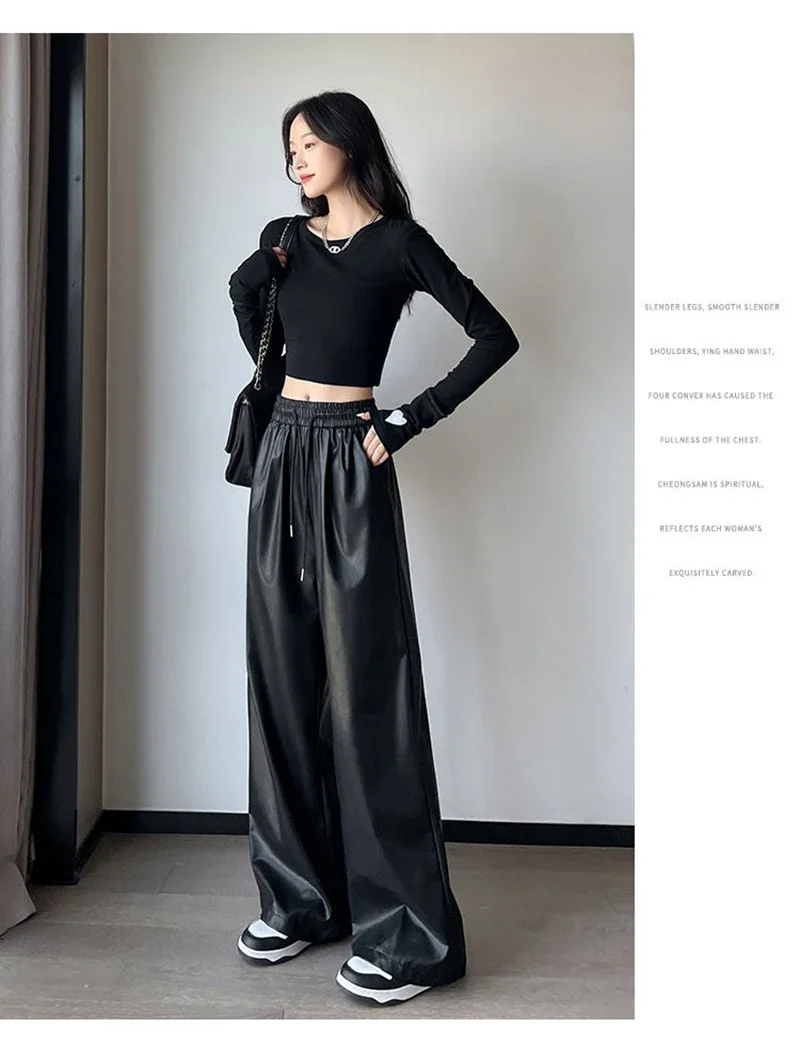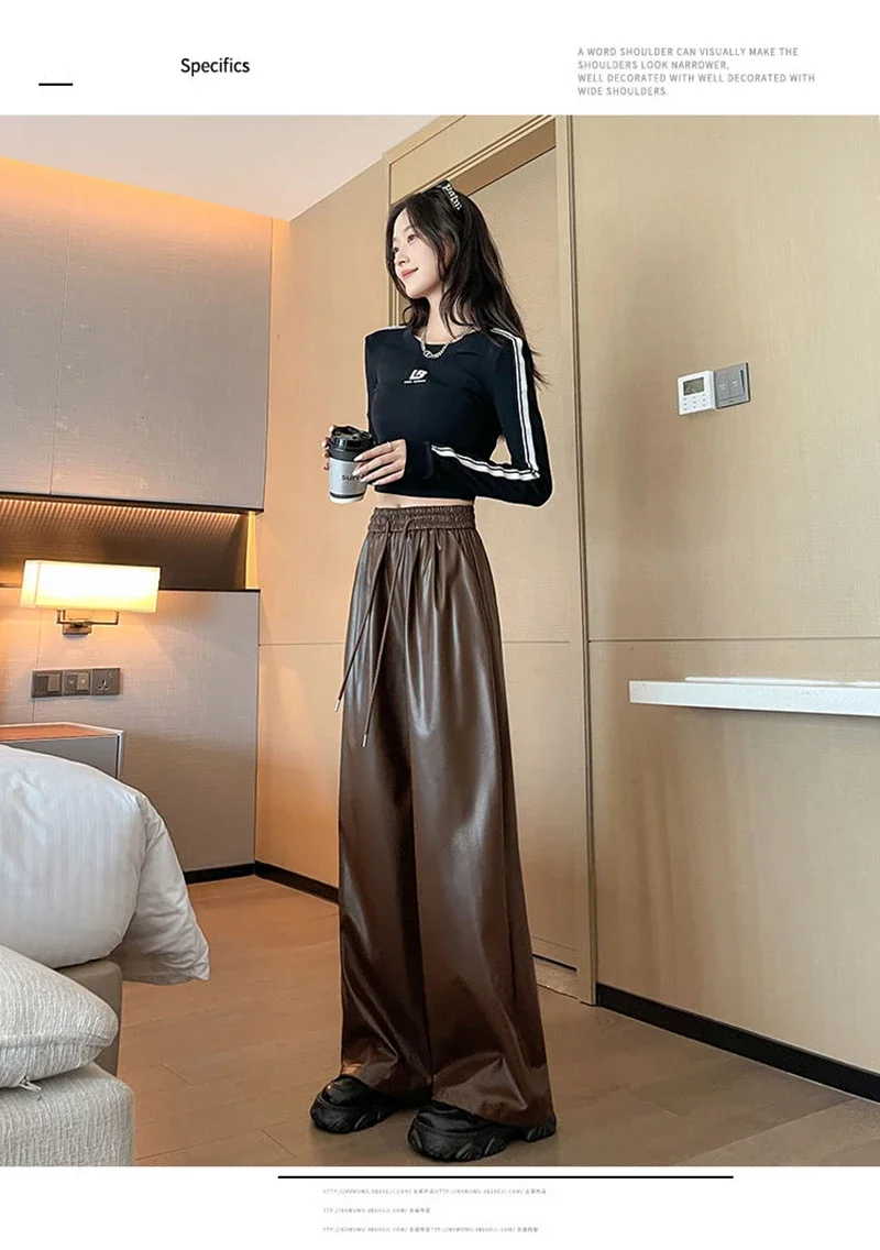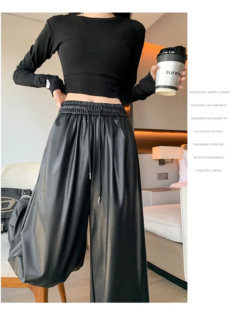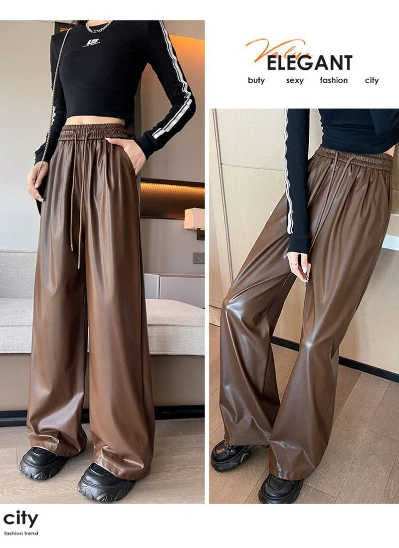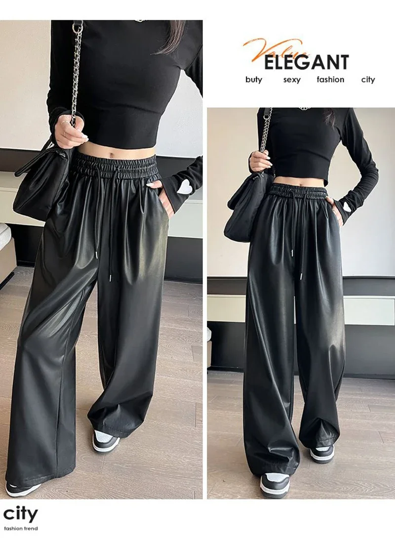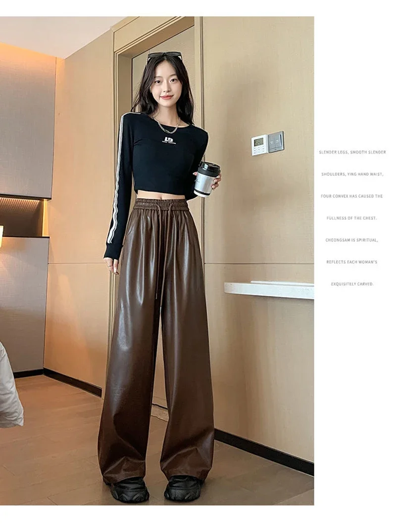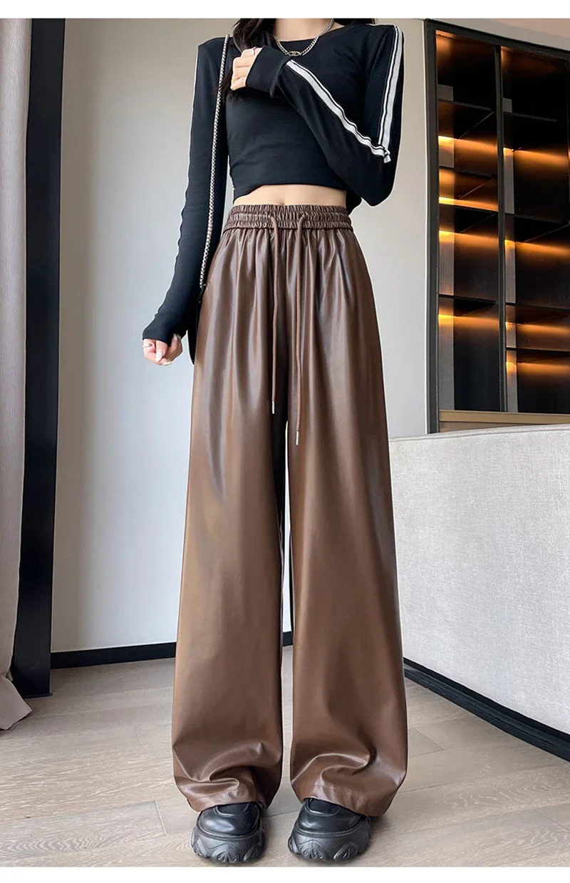 Y2K Vintage Pu Faux Leather Trousers Women Fall Wide Leg Pants Korean Drawstring High Waist Loose Pocket Solid Straight Bottoms