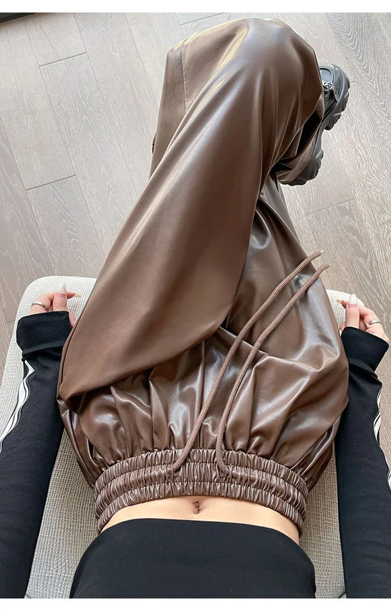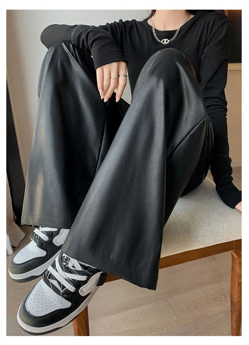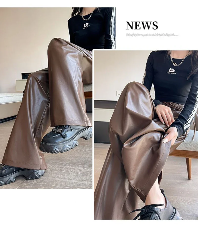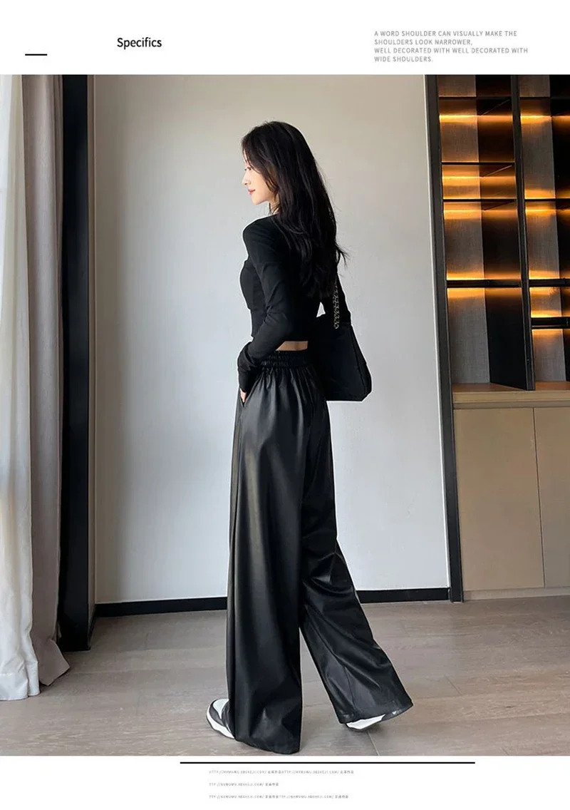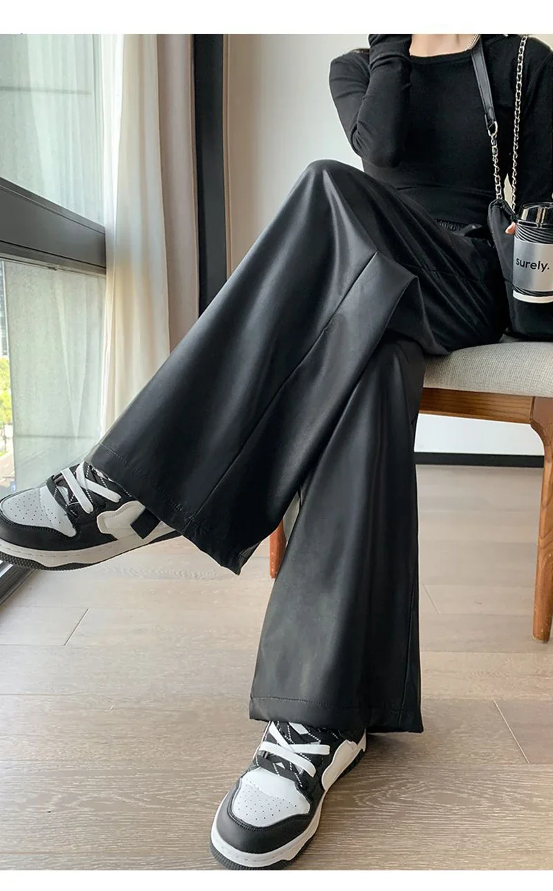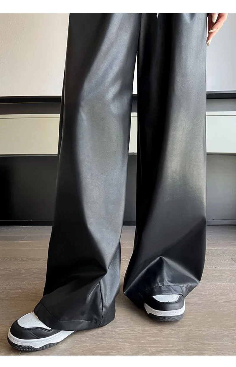 Y2K Vintage Pu Faux Leather Trousers Women Fall Wide Leg Pants Korean Drawstring High Waist Loose Pocket Solid Straight Bottoms