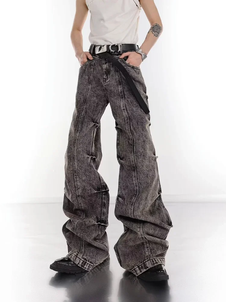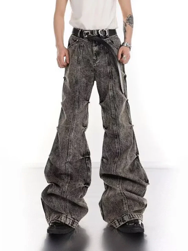 Y2K Wide Leg Jeans Men Pleated Vintage Fashion Micro Flared Denim Pants High Street Bootcut Trousers Male Stack Design