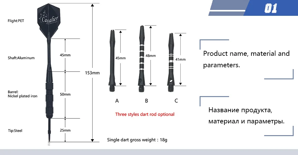 Darts Shafts length:A 45 mm,  B 48 mm,C 41 mm.