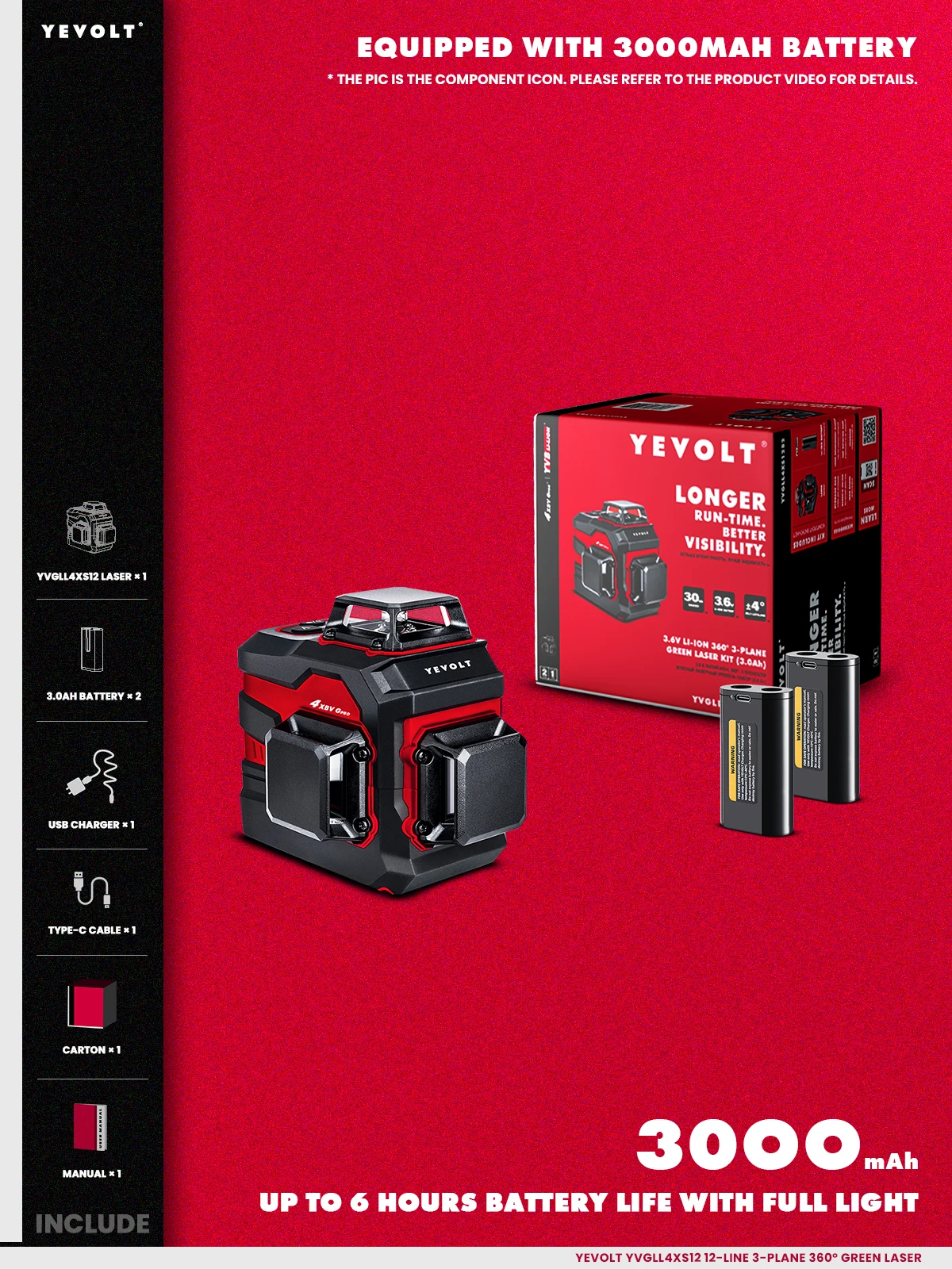 YEVOLT YVGLL4XS12DP 12-Line Measuring Tools Green Laser Level Kit with 3Ah Power*2 Self-Leveling Horizontal & Vertical Beam