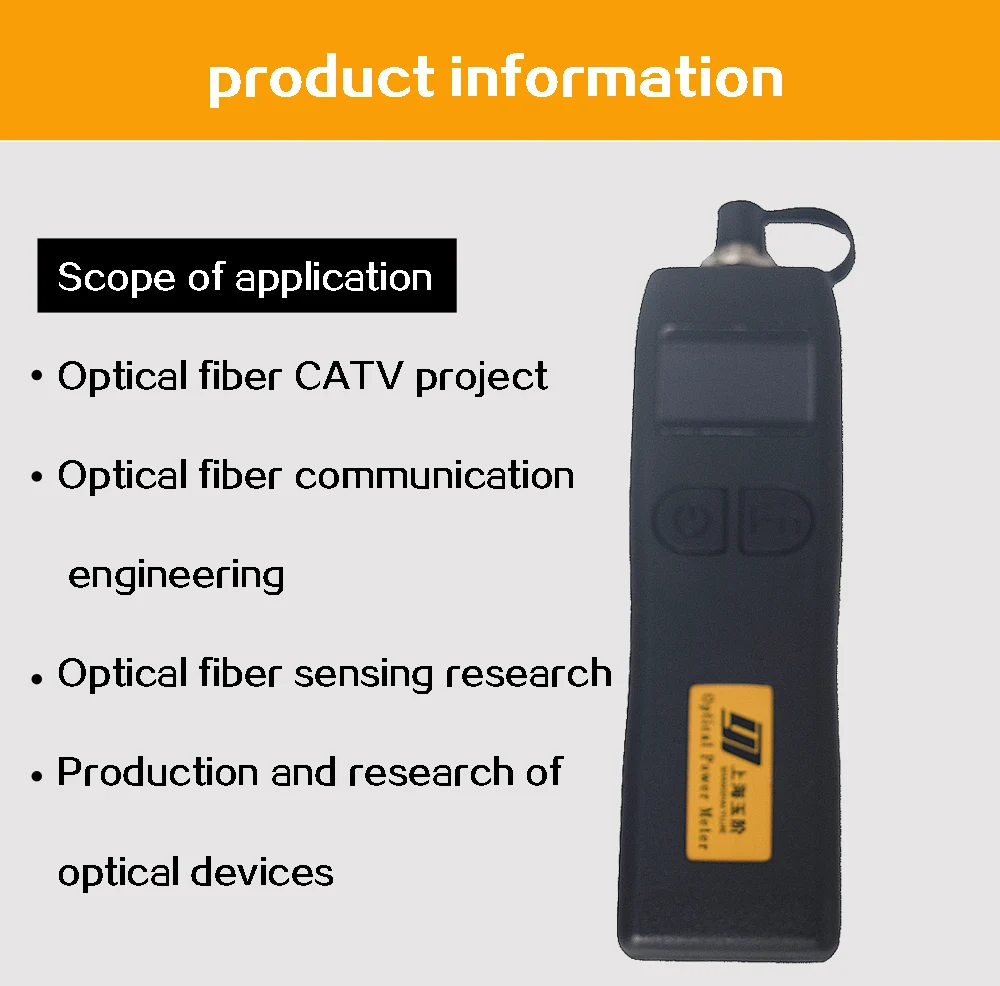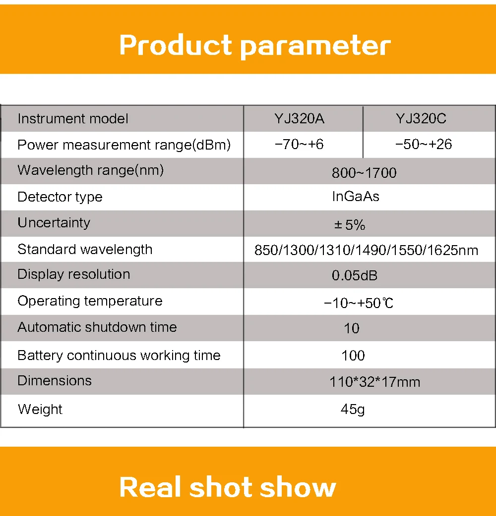 YJ-320 handheld optical power meter is a compact and an easy-to-use testing instrument for optical fiber networks, which can be used for absolute optical power measurements as well as for relative loss measurements in optical fibers. It features ingenious appearance, wide range of power measurement, high accuracy .