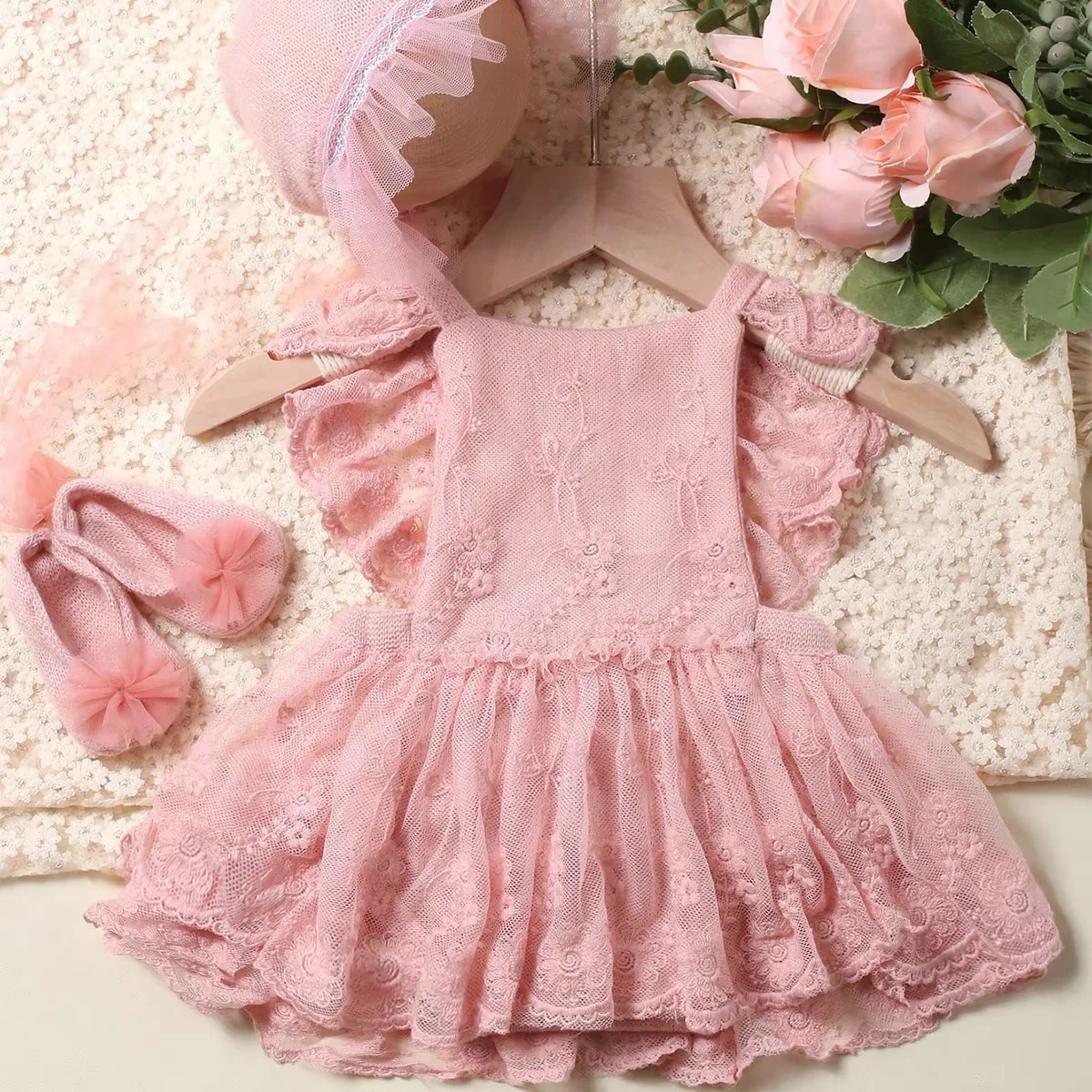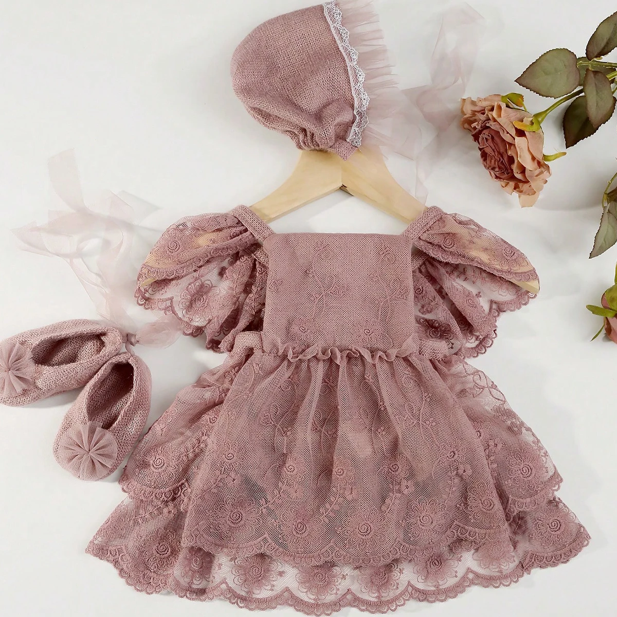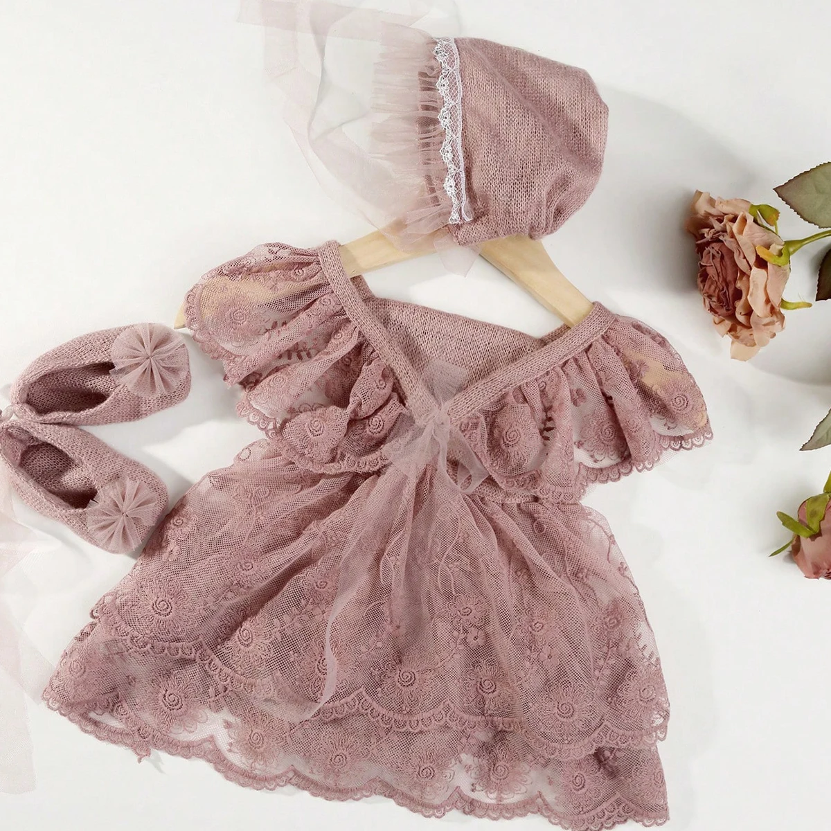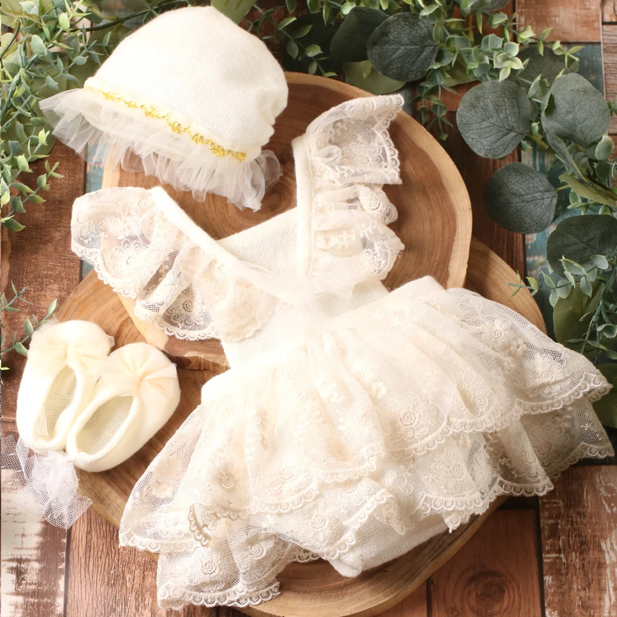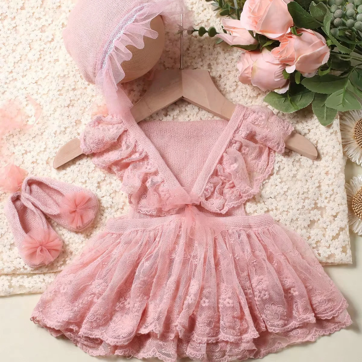 Ylsteed Newborn Girl Photography Outfits(Romper+Hat+Shoes) Baby Lace Romper with Match Hat and Mini Shoes Infant Posing Props