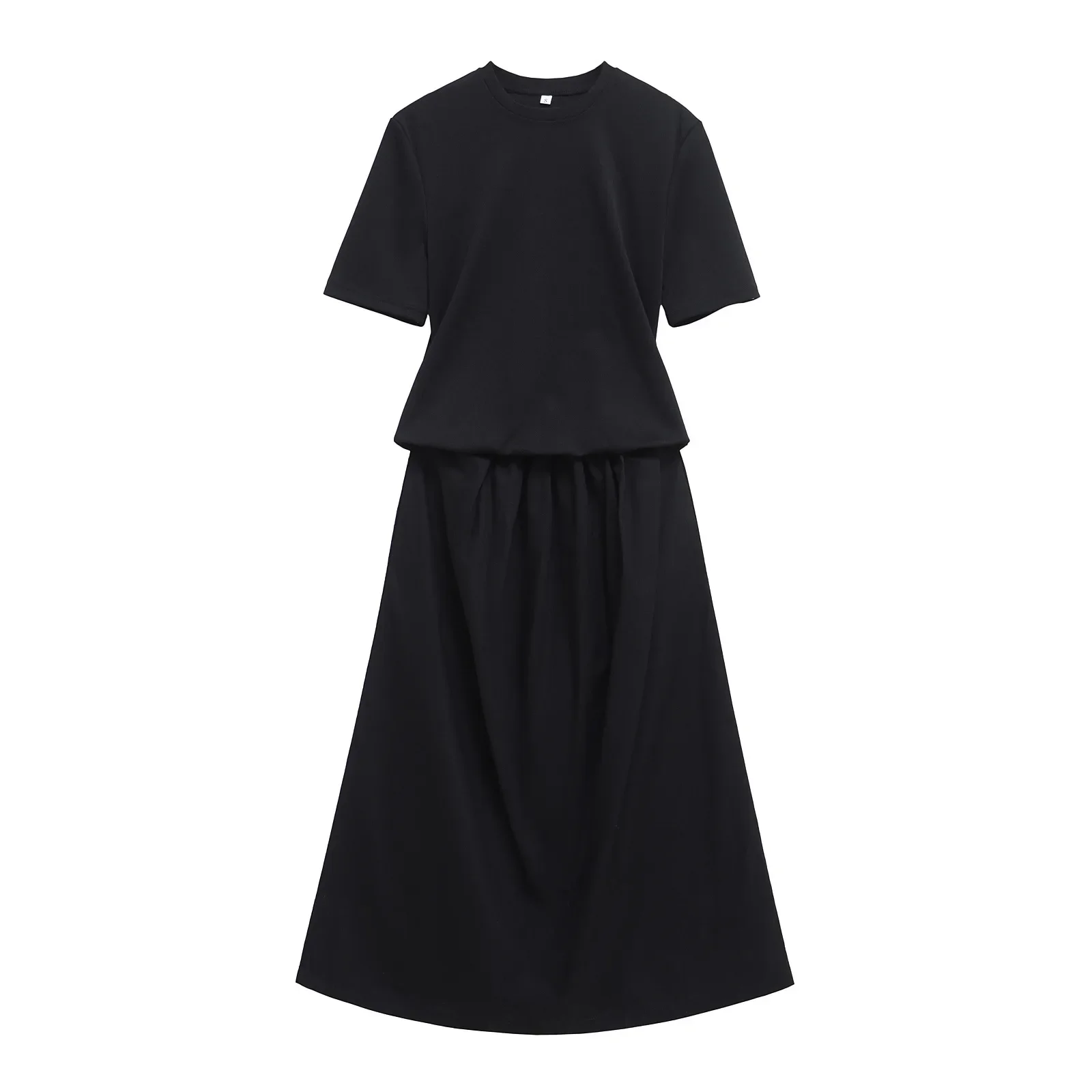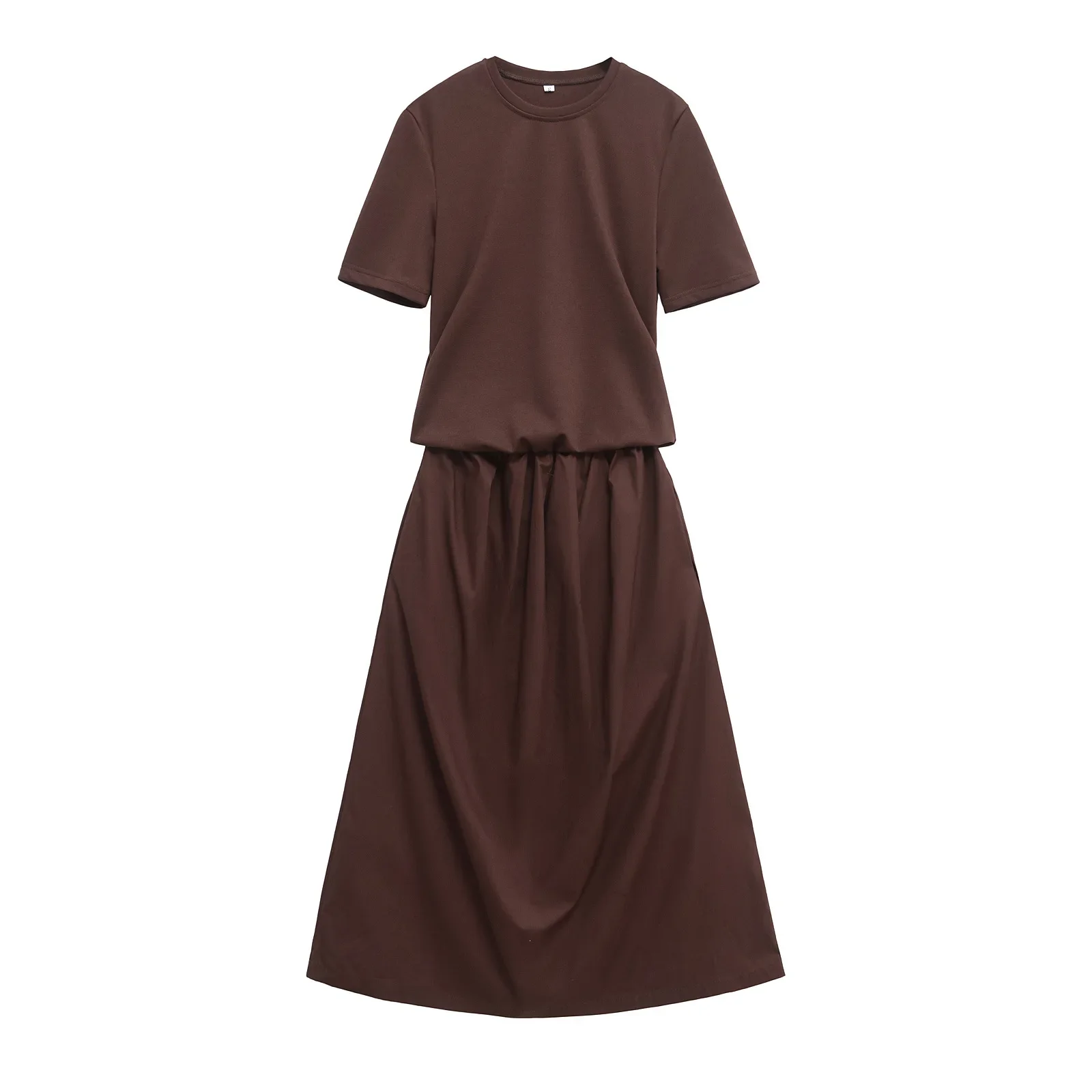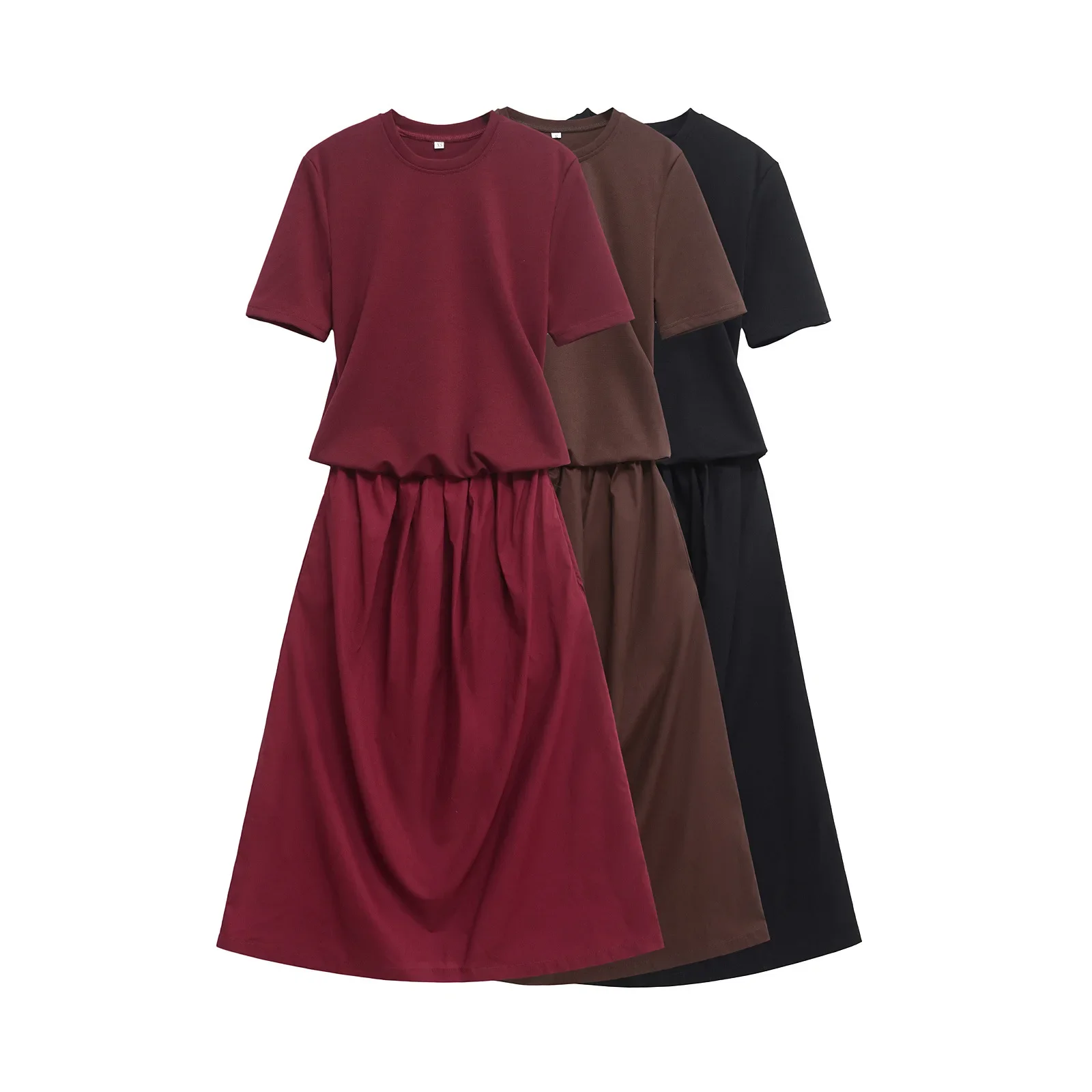 ZBZA Women’s Contrasting Midi Dress Round Neck Short Sleeves Splicing Design Classic Long Skirt Spring and Summer New Chic Skirt