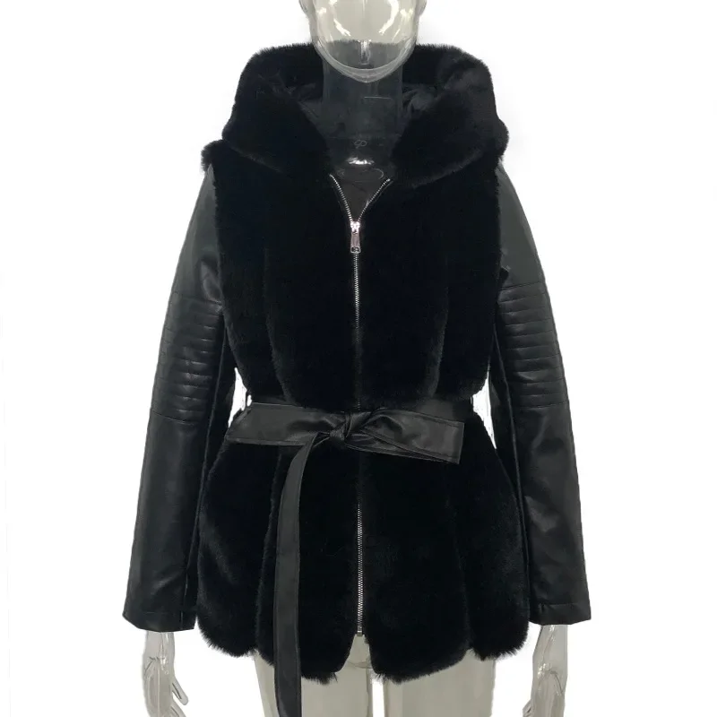 Zip Jacket Outwear Clothing Long Sleeve Fur Jacket Women’s Belt Hooded Solid Color Winter Keep Warm Fashion Faux Leather Jackets