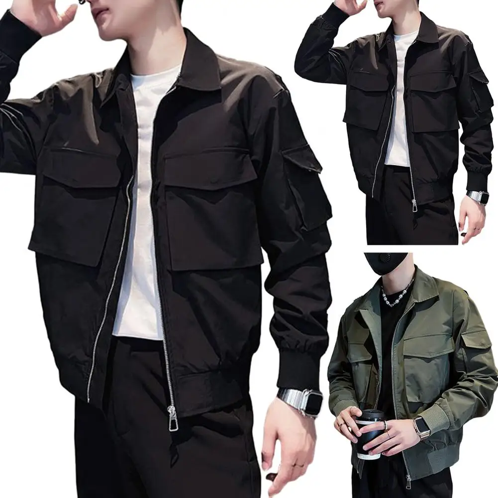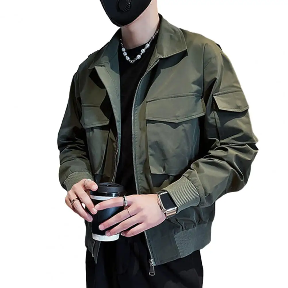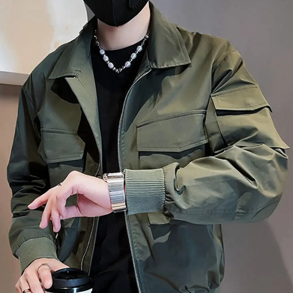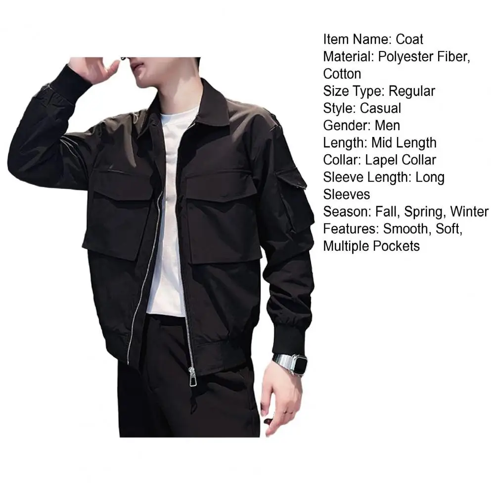 Zipper Jacket Men’s Solid Color Zipper Closure Jacket with Lapel Buttons Multiple Pockets Casual Hip Hop Streetwear for Smooth