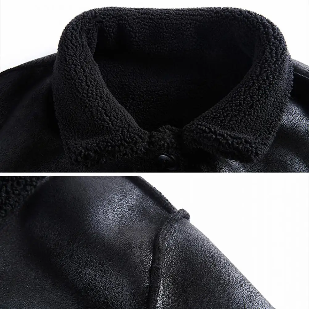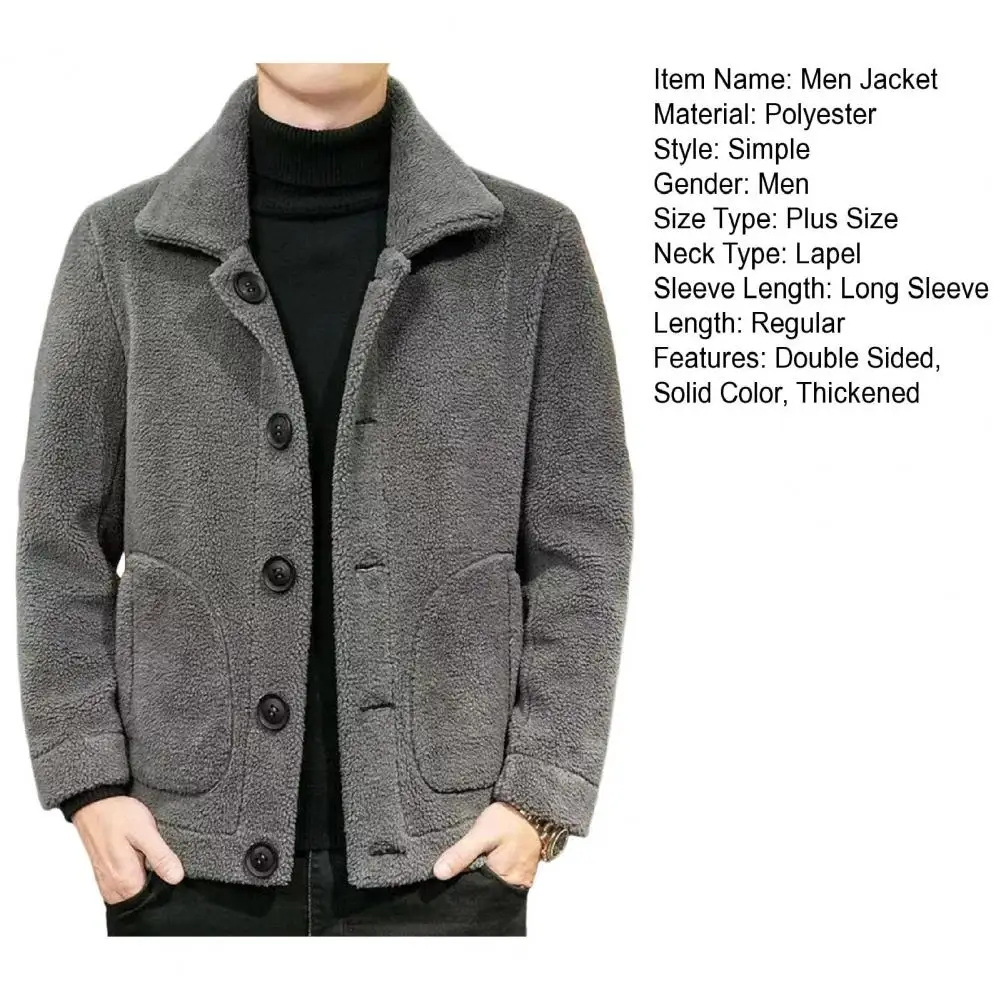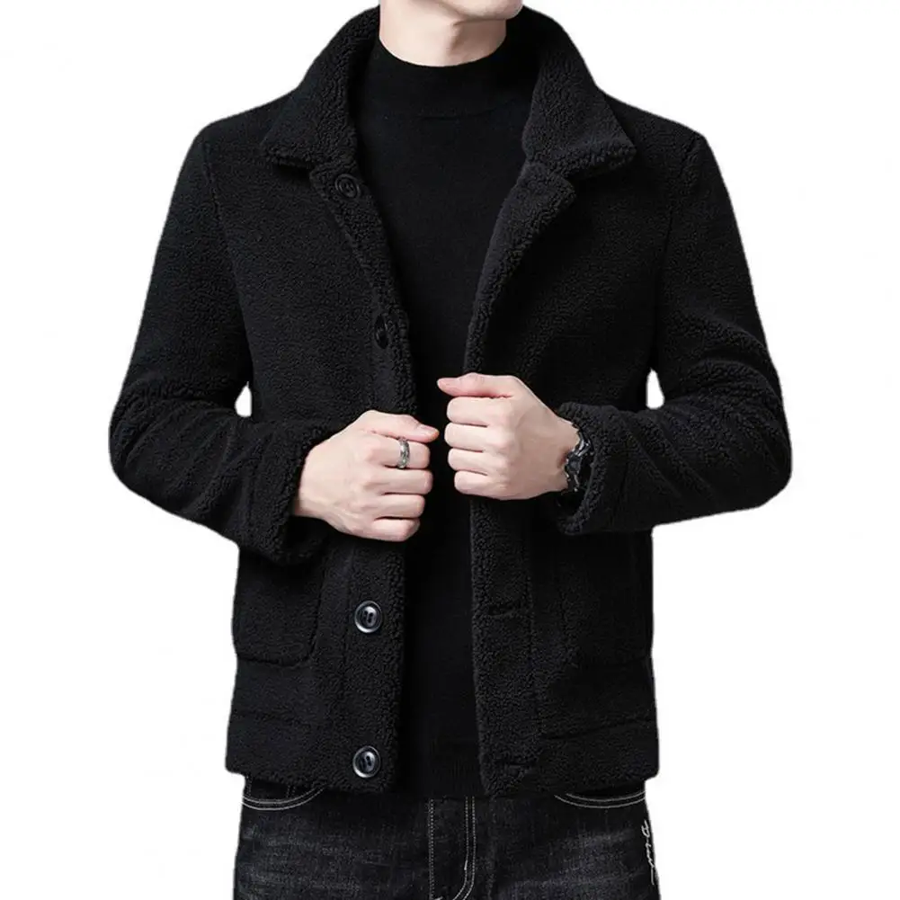 Men Jacket Lapel Long Sleeve Single Breasted Coat with Pockets Solid Color Reversible Design Polar Fleece Faux Leather Outwear